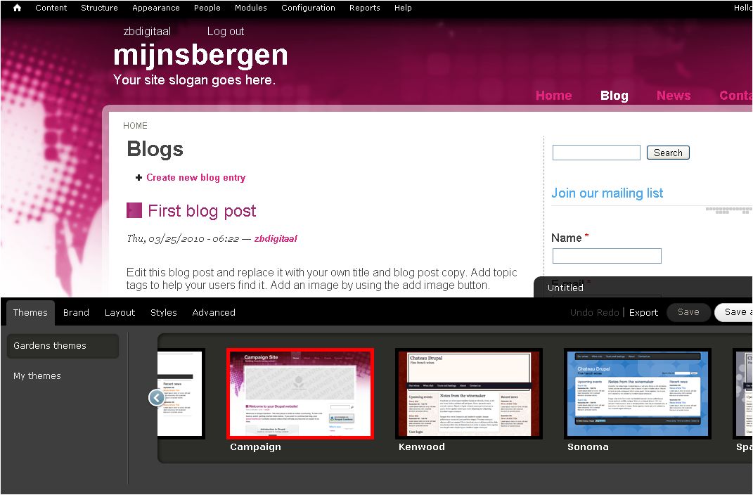 Eenmaal ‘binnen’ constateerde ik dat je in mum van tijd de basis voor een website kunt leggen. Je hoeft alleen een naam te verzinnen die voor het domein .drupalgardens.com komt te staan en je kunt, als je dat wilt, dan meteen kiezen voor een ‘campagnesjabloon’, dat voorziet in een website met een een blogfunctionaliteit, een forum, een mailinglijst, een nieuwspagina en functionaliteiten voor reacties, koppelingen met sociale netwerken en attenderingen. De keuzelijst laat zich makkelijk lezen en bedienen.