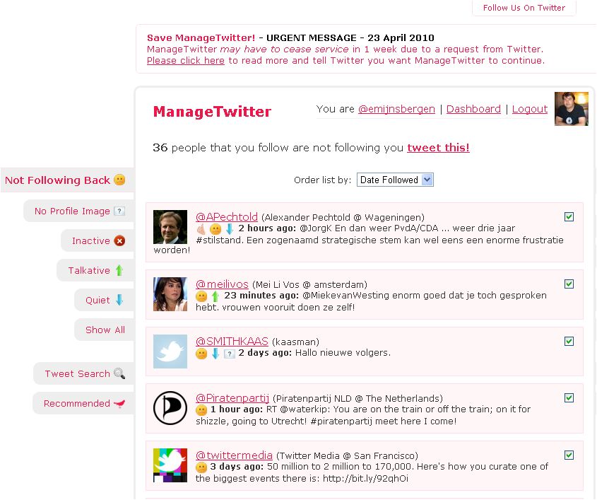 TechCrunch besteedt deze keer echter aandacht aan deze site omdat Twitter (het bedrijf) wil dat Manage Twitter stopt met het aanbieden van de mogelijkheid tot ‘bulkontvolgen’. Blijkbaar vindt men het niet leuk dat je met een paar muisklikken iedereen die inactief is kunt ontvolgen. Ik begrijp niet goed waarom men dat niet leuk vindt. Het is handig en nuttig. Als je veel mensen volgt ben je op een gegeven moment gewoon het overzicht kwijt. Het is te veel werk om alles handmatig te beheren.