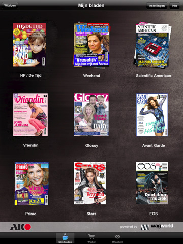 AKO heeft zijn langverwachte tijdschriften-App voor de iPad geopend: AKO MagWorld. AKO heeft z’n beste gedaan om het aanbod breed en aantrekkelijk te maken. De digitale kiosk biedt nu al 32 titels. Van HP/De Tijd tot Weekend, van iCreate tot Scientific American, van Quote tot Auto Review. Binnenkort komen daar nog enkele tientallen titels bij. Tijdschriften zijn iets goedkoper dan in de winkel en zijn meestal eerder beschikbaar. Je kan ook oude nummers kopen of een abonnement afsluiten. Wis je een gekocht tijdschrift, dan kan je het binnen een jaar opnieuw (gratis) downloaden. AKO belooft dat er binnenkort ook ‘verrijkte’ uitgaves verschijnen met interactiviteit, bewegend beeld en geluid.