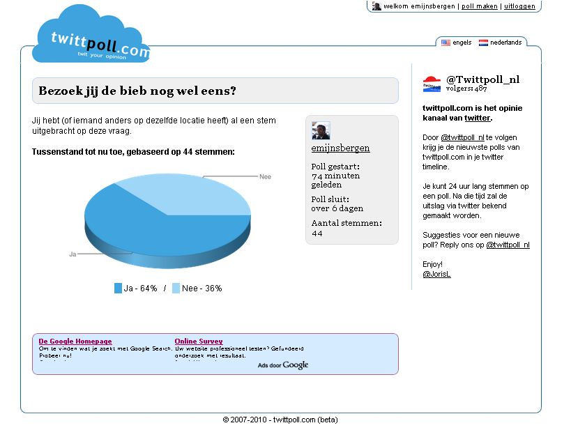 Wat ik graag eens zou willen weten is hoeveel mensen de bibliotheek nog daadwerkelijk bezoeken en hechten aan het bestaan van een hoofdgebouw. Dat antwoord volgt ongetwijfeld nog, maar het liefst zou ik het eens op straat vragen, aan duizend willekeurige voorbijgangers. Misschien doe ik dat nog wel eens. Op Twitter heb ik een korte poll opgezet, maar die geeft uiteraard maar een beperkte indicatie. Een aanzienlijk deel van m’n contacten op Twitter is immers afkomstig uit de bibliotheeksector, en ‘ja’ of ‘nee’ zegt helemaal niets over de mening over bibliotheken. Gelukkig lijkt Zeelandnet het initiatief over te willen nemen en de vraag morgen ook op de site te gaan stellen. Cool. Dat is toch weer net iets representatiever.