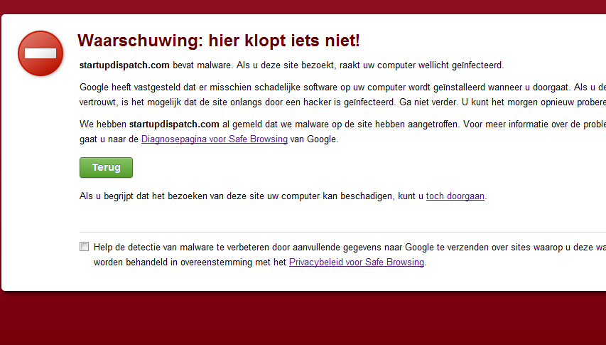 Update: later lukte het doorklikken ondanks de waarschuwing me toch. Tegelijktijd doet de site nu ook moeilijk in andere browsers. Wellicht is de waarschuwing dan toch terecht en is het gewoon toeval dat die juist vandaag opdook. Ik houd een slag om de arm…