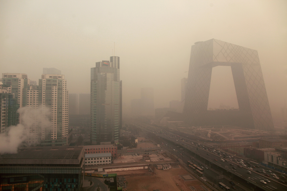 Heavy pollution surrounds the China Central Television headquarters building (right) in Beijing on January 18, 2012. The US embassy, which has its own pollution measuring system and which rates anything over 150 as unhealthy, was showing an index of 403, or ‘hazardous’.