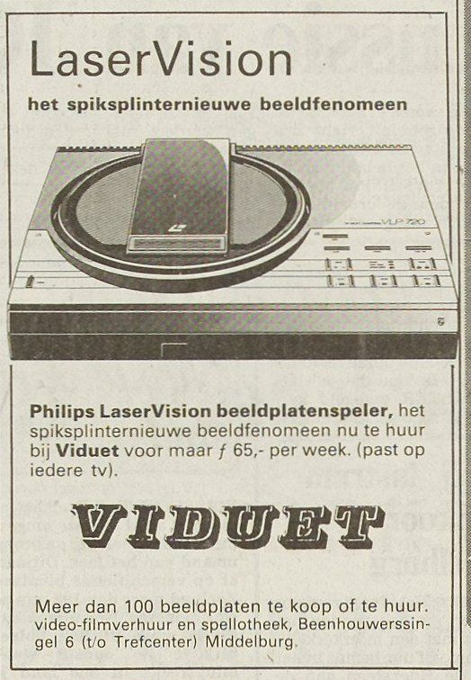 In de Krantenbank Zeeland vond ik een advertentie van Viduet, de videotheek waar ik eind jaren ’90 zelf werkte. Tot mijn verbazing dateert deze aanprijzing van Philips LaserVision (“het spiksplinternieuwe beeldfenomeen nu te huur voor maar 65 gulden per week”) van 7 mei 1983. Tot op de dag van vandaag verkeerde ik in de veronderstelling dat de beeldplaat pas op de markt verscheen toen de CD al gemeengoed was, ergens na 1985. Niet dus. De beeldplaat werd al ontwikkeld in de vroege jaren ’70 en zou na het floppen juist worden doorontwikkeld tot de Compact Disc.