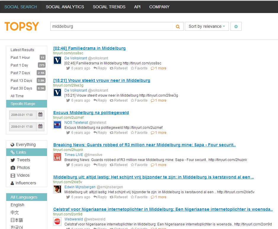 Vandaag kondigde team Topsy aan dat de index van de zoekmachine voortaan alle tweets van nu tot maart 2006 omvat. Dat maakt het alleen nog maar mooier. In een handomdraai zoeken naar nieuwskoppen uit 2007, zoals in het screenshot hierboven, of even checken wat iemand (of jij zelf) in een bepaalde periode twitterde.