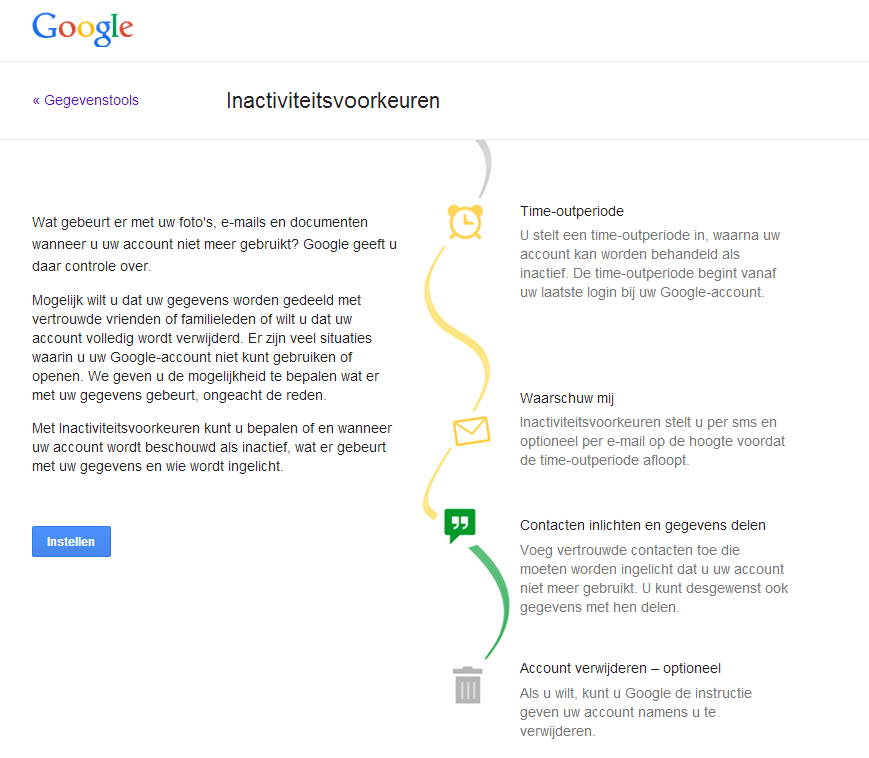 Wat gebeurt er met uw foto’s, e-mails en documenten wanneer u uw account niet meer gebruikt? Google geeft u daar controle over. Mogelijk wilt u dat uw gegevens worden gedeeld met vertrouwde vrienden of familieleden of wilt u dat uw account volledig wordt verwijderd. Er zijn veel situaties waarin u uw Google-account niet kunt gebruiken of openen. We geven u de mogelijkheid te bepalen wat er met uw gegevens gebeurt, ongeacht de reden. Met Inactiviteitsvoorkeuren kunt u bepalen of en wanneer uw account wordt beschouwd als inactief, wat er gebeurt met uw gegevens en wie wordt ingelicht.